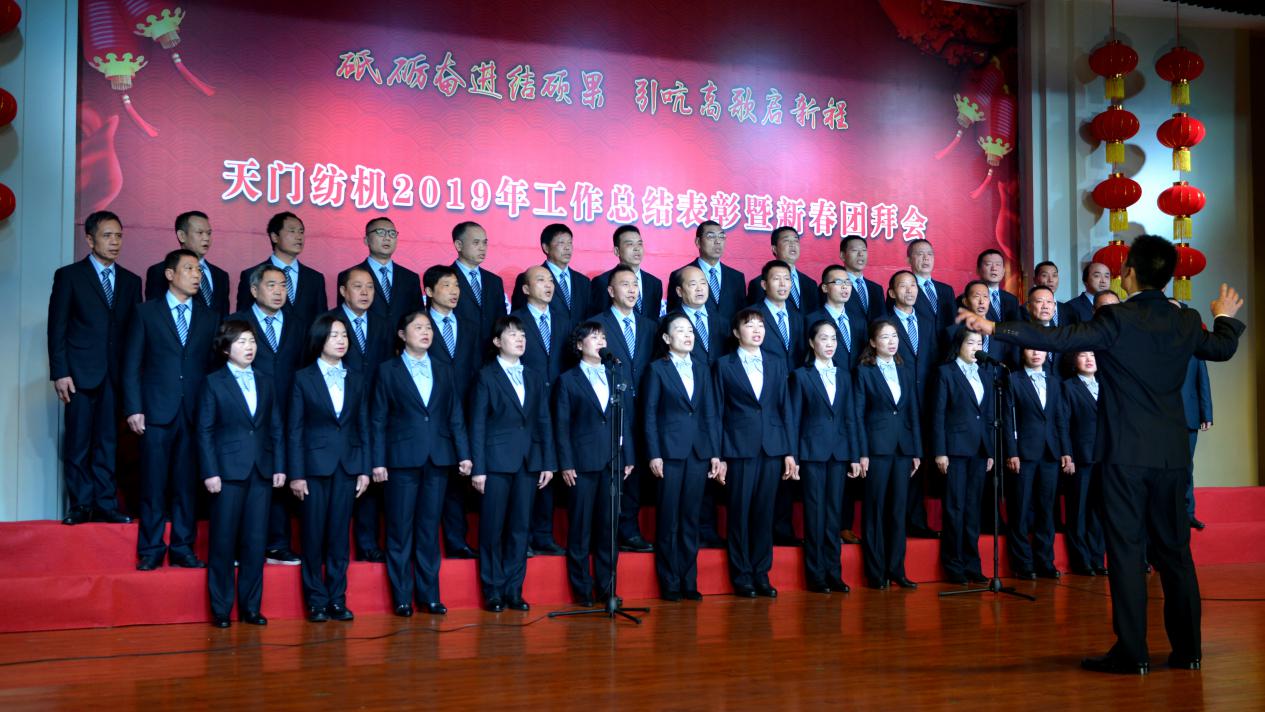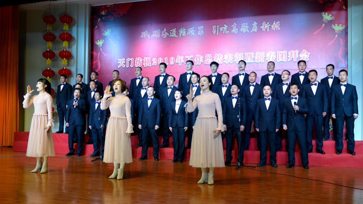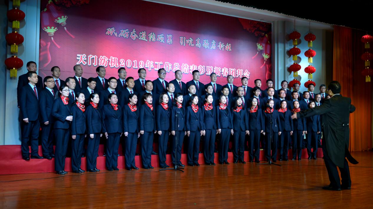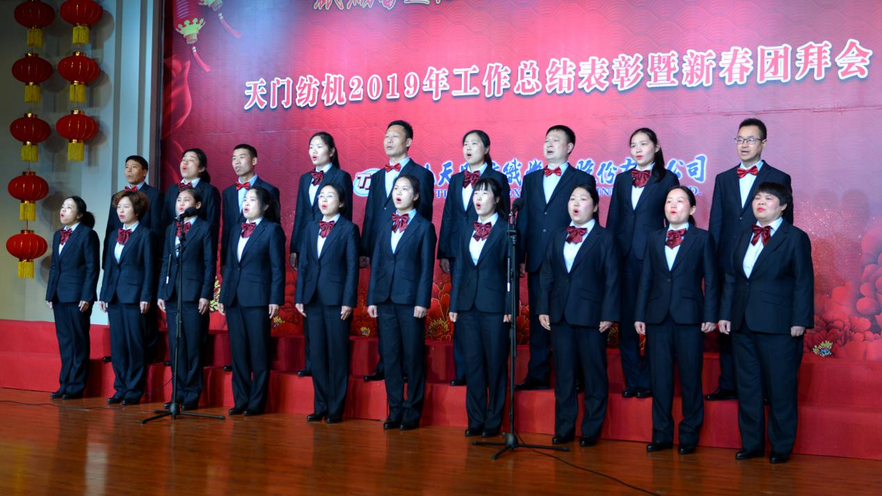 2020年1月21日下午,湖北天門紡織機(jī)械股份有限公司綜合樓多功能廳張燈結(jié)彩、暖流融融,一場主題為“砥礪奮進(jìn)結(jié)碩果、引吭高歌啟新程”的年度總結(jié)表彰暨新春團(tuán)拜會(huì)在這里舉行,400多名員工身著公司新佩發(fā)的西服套裝,精神奕奕地走進(jìn)會(huì)場。13:00整,三位主持人靚妝登場,宣布2019年度總結(jié)表彰暨新春團(tuán)拜會(huì)開始。
