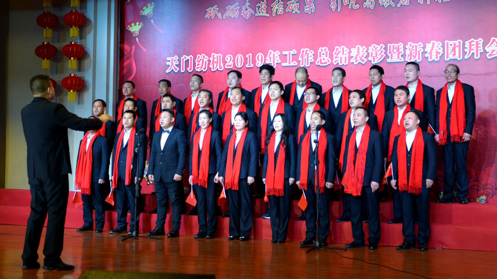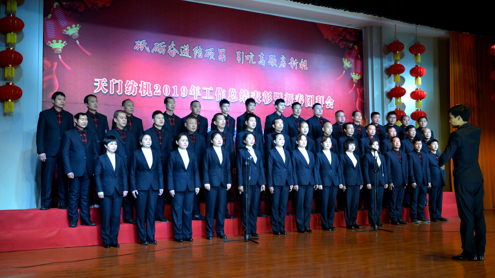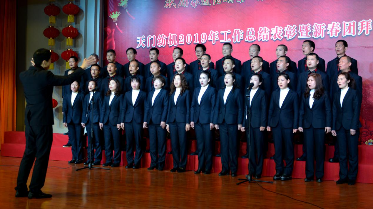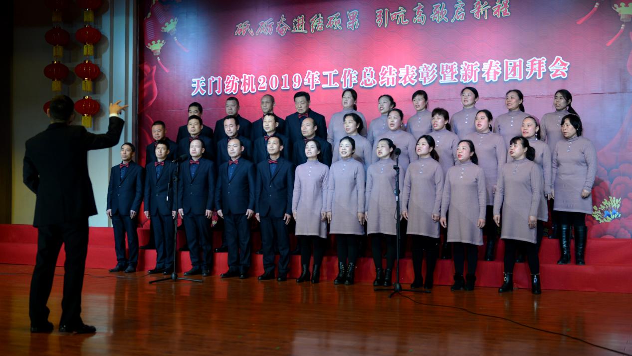 2020年1月21日下午,湖北天門紡織機(jī)械股份有限公司綜合樓多功能廳張燈結(jié)彩、暖流融融,一場主題為“砥礪奮進(jìn)結(jié)碩果、引吭高歌啟新程”的年度總結(jié)表彰暨新春團(tuán)拜會(huì)在這里舉行,400多名員工身著公司新佩發(fā)的西服套裝,精神奕奕地走進(jìn)會(huì)場。13:00整,三位主持人靚妝登場,宣布2019年度總結(jié)表彰暨新春團(tuán)拜會(huì)開始。