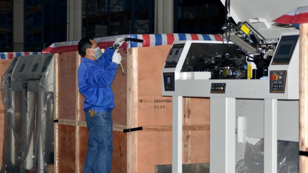 總裝車間主任彭文武對發(fā)貨產(chǎn)品包裝作邊角固定