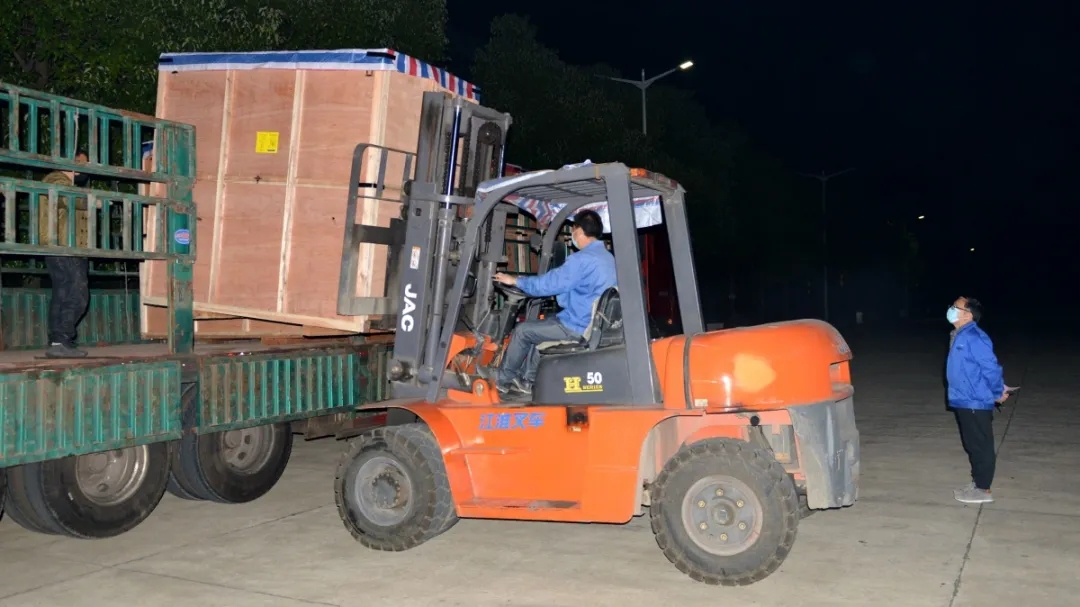 夜幕降臨,公司叉車司機姚順華抓緊時間將包裝好的產(chǎn)品進行裝車作業(yè)