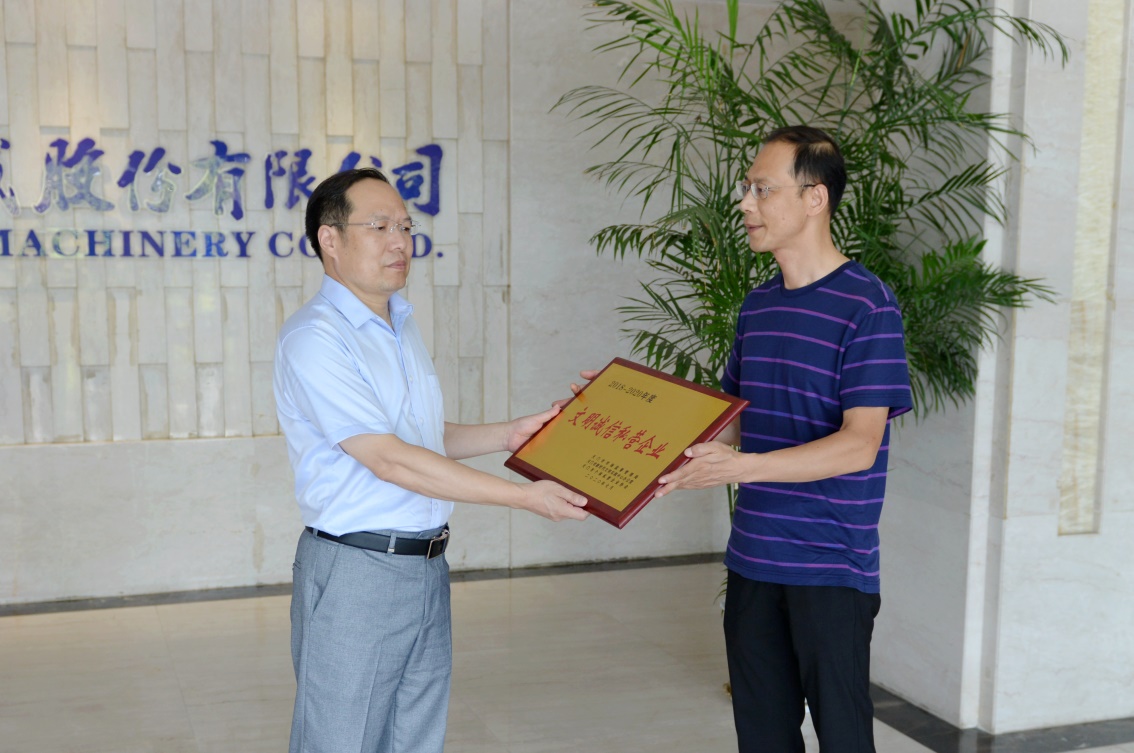 8月18日,天門(mén)市市場(chǎng)監(jiān)督管理局對(duì)天門(mén)紡機(jī)獲得的"文明誠(chéng)信私營(yíng)企業(yè) "榮譽(yù)進(jìn)行現(xiàn)場(chǎng)授牌,黨委書(shū)記魯?shù)挛拇砉窘优?。