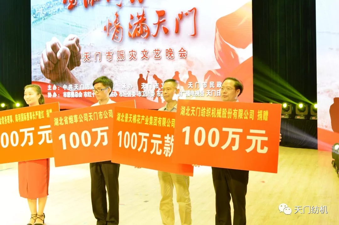 2016年,天門(mén)全市遭遇百年一遇的特大洪澇災(zāi)害,人民生命財(cái)產(chǎn)受到嚴(yán)重威脅。天門(mén)紡機(jī)積極參與政府組織的抗洪救災(zāi)慰問(wèn)活動(dòng),為奮戰(zhàn)在一線的防汛抗災(zāi)人員送去食品、藥品和救災(zāi)物資,并捐贈(zèng)100萬(wàn)元抗洪救災(zāi)款。