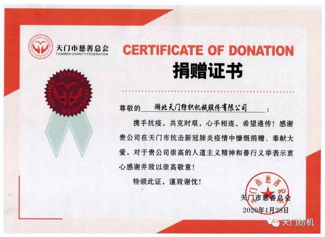 2020年,面對(duì)來(lái)勢(shì)洶洶的新冠疫情,作為一家民營(yíng)企業(yè),天門(mén)紡機(jī)不計(jì)經(jīng)濟(jì)損失,率先提出了“不給黨和政府添麻煩,不給疫情防控添壓力,不給社會(huì)就業(yè)添負(fù)擔(dān)”,率先停產(chǎn)歇業(yè),率先捐贈(zèng)100萬(wàn)元,專門(mén)用于收治新冠患者,采購(gòu)短缺醫(yī)療物資。公司管理層還通過(guò)多種渠道,主動(dòng)與有影響力基金會(huì)取得聯(lián)絡(luò),分6個(gè)批次向醫(yī)院、社區(qū)捐贈(zèng)了30萬(wàn)只醫(yī)用口罩、10噸醫(yī)用消毒液、2萬(wàn)件防護(hù)服等大量物資,在抗疫的危急時(shí)刻發(fā)揮了重要作用。