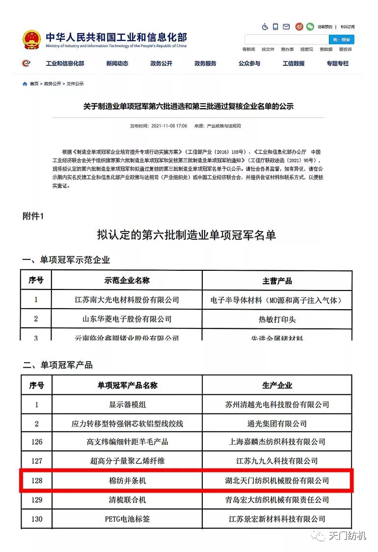 近日,國家工信部和中國工業(yè)經(jīng)濟(jì)聯(lián)合會(huì)發(fā)布通知(工信廳聯(lián)政法函〔2021〕95號(hào)),擬認(rèn)定天門紡機(jī)并條機(jī)為“單項(xiàng)冠軍產(chǎn)品”。至此,天門紡機(jī)所產(chǎn)的系列并條機(jī)成為了國內(nèi)唯一獲此殊榮的棉紡并條機(jī)。