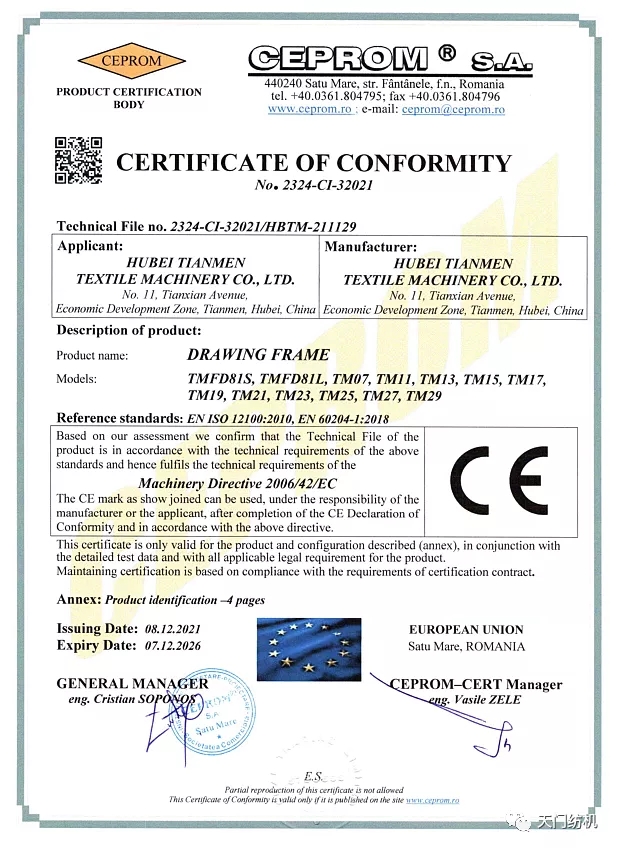 產(chǎn)品得到國際市場認(rèn)可,天門紡機(jī)獲得歐盟“CE”證書