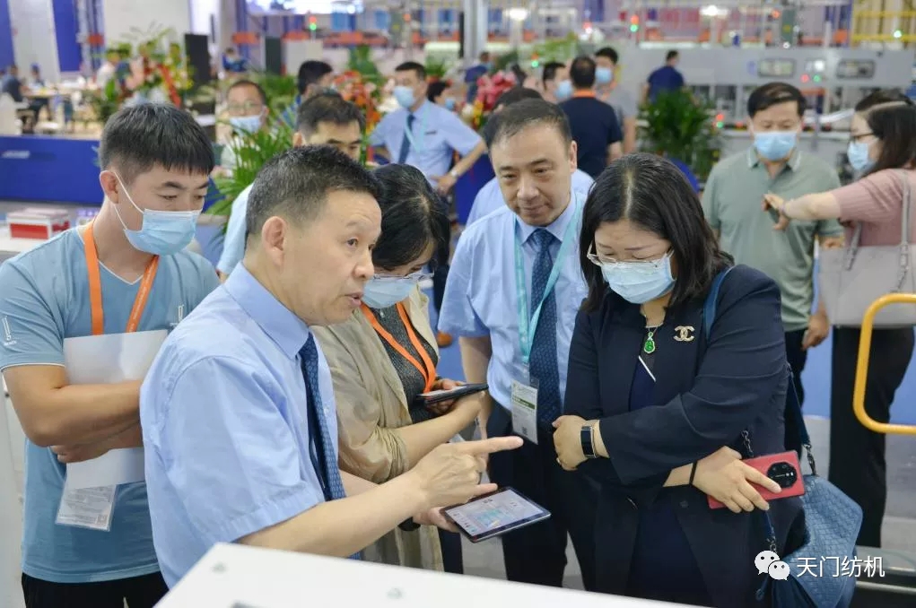 2021年6月12日,在上海國際紡機(jī)展上天門紡機(jī)舉行“開創(chuàng)并條工序全自調(diào)勻整新時(shí)代”新品發(fā)布會,中紡聯(lián)黨委書記高勇使用手持終端為新產(chǎn)品開機(jī)