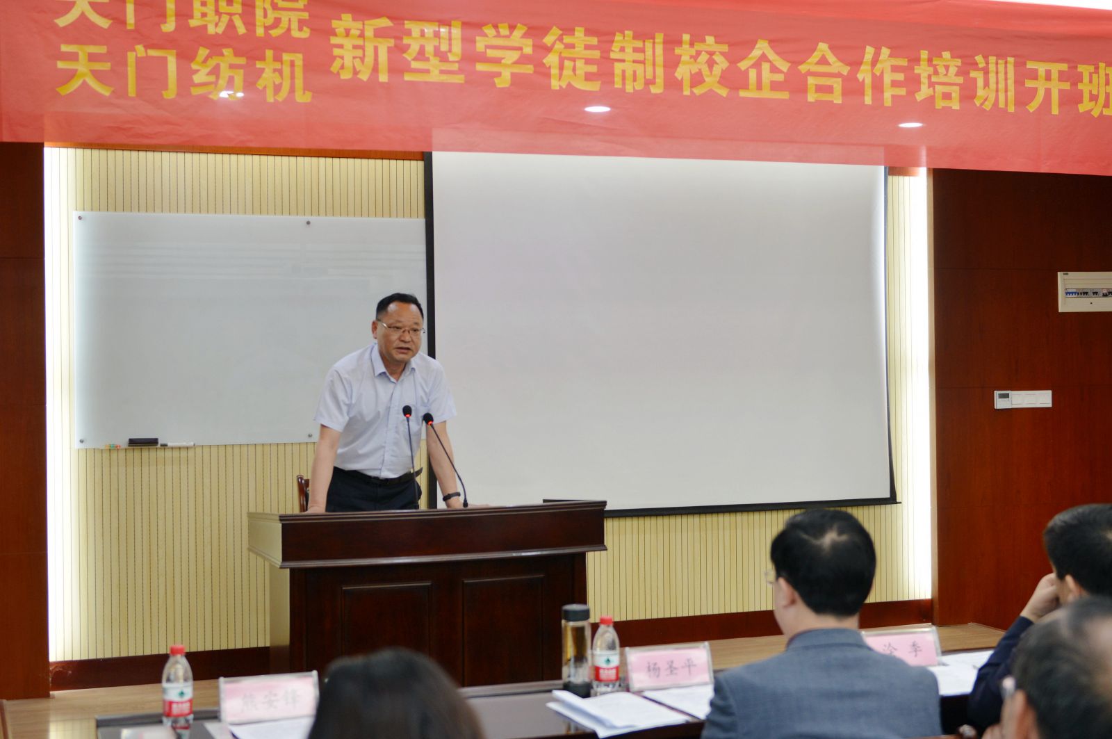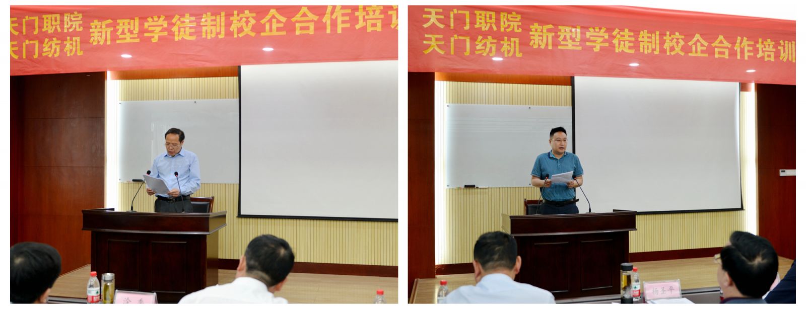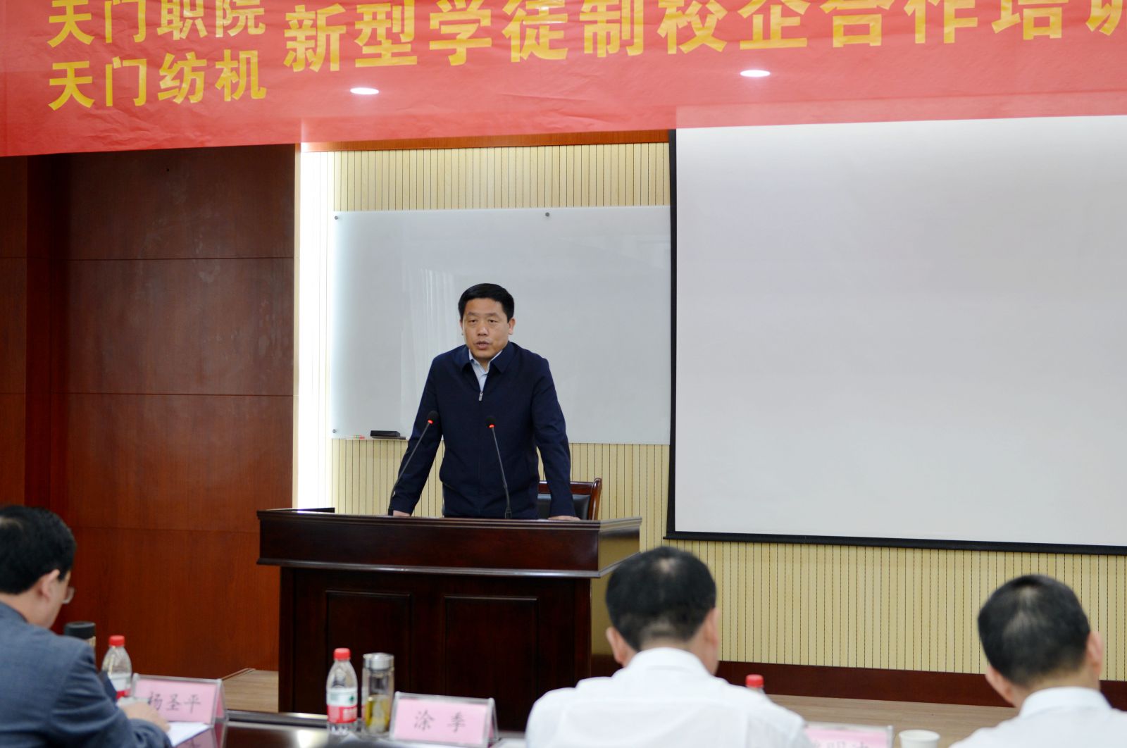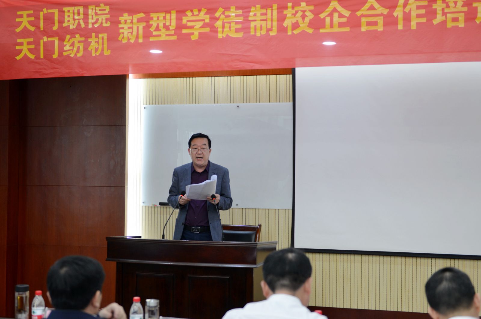 天門紡機黨委書記魯?shù)挛慕榻B了《天門職院與天門紡機新型學(xué)徒制培訓(xùn)方案》,天門職業(yè)學(xué)院教師何漢兵作了發(fā)言,他代表全體培訓(xùn)教師表態(tài),一定不負期望,精心備課,靈活施教,圓滿完成教學(xué)任務(wù)。