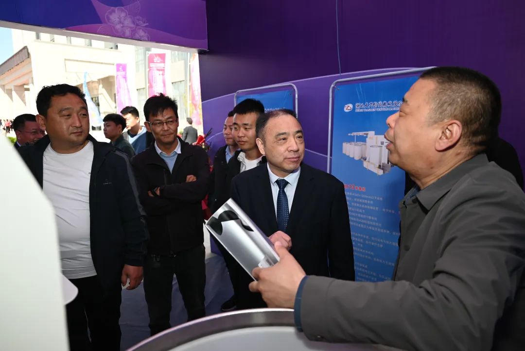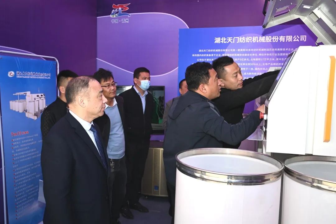 天門紡機(jī)總經(jīng)理焦倫進(jìn)向蒞臨公司展位的晉州市長王林(右2)、中國服裝協(xié)會常務(wù)副會長楊金純(右1)、晉州市紡織服裝行業(yè)協(xié)會會長李永強(左1)介紹公司與晉州紡織企業(yè)合作情況