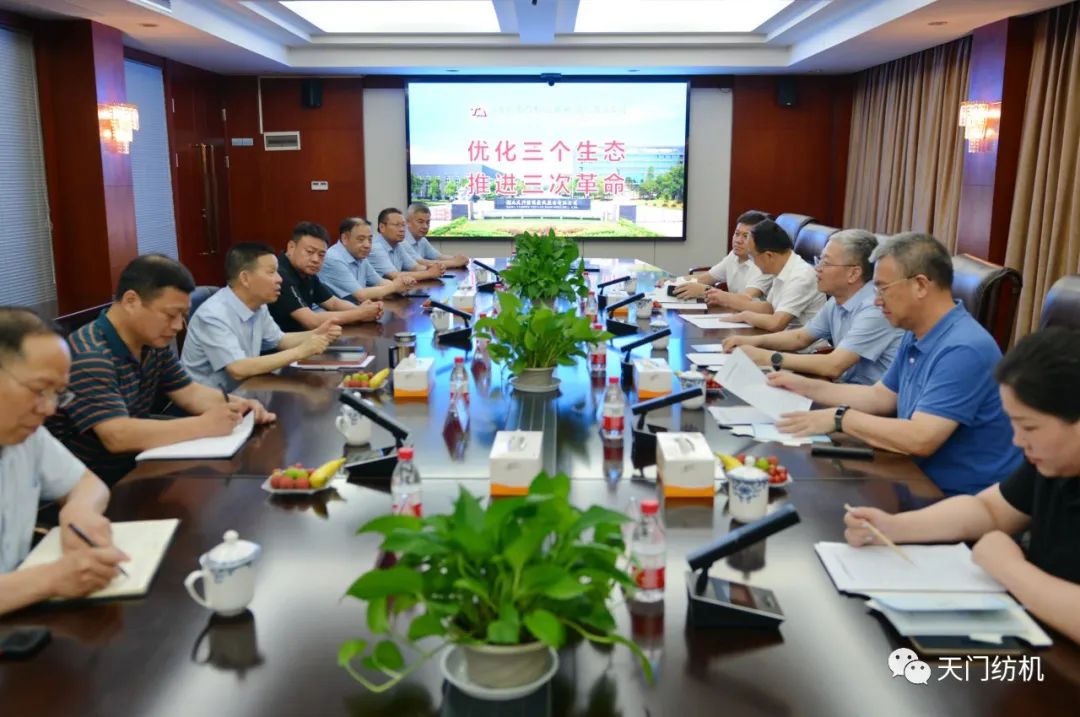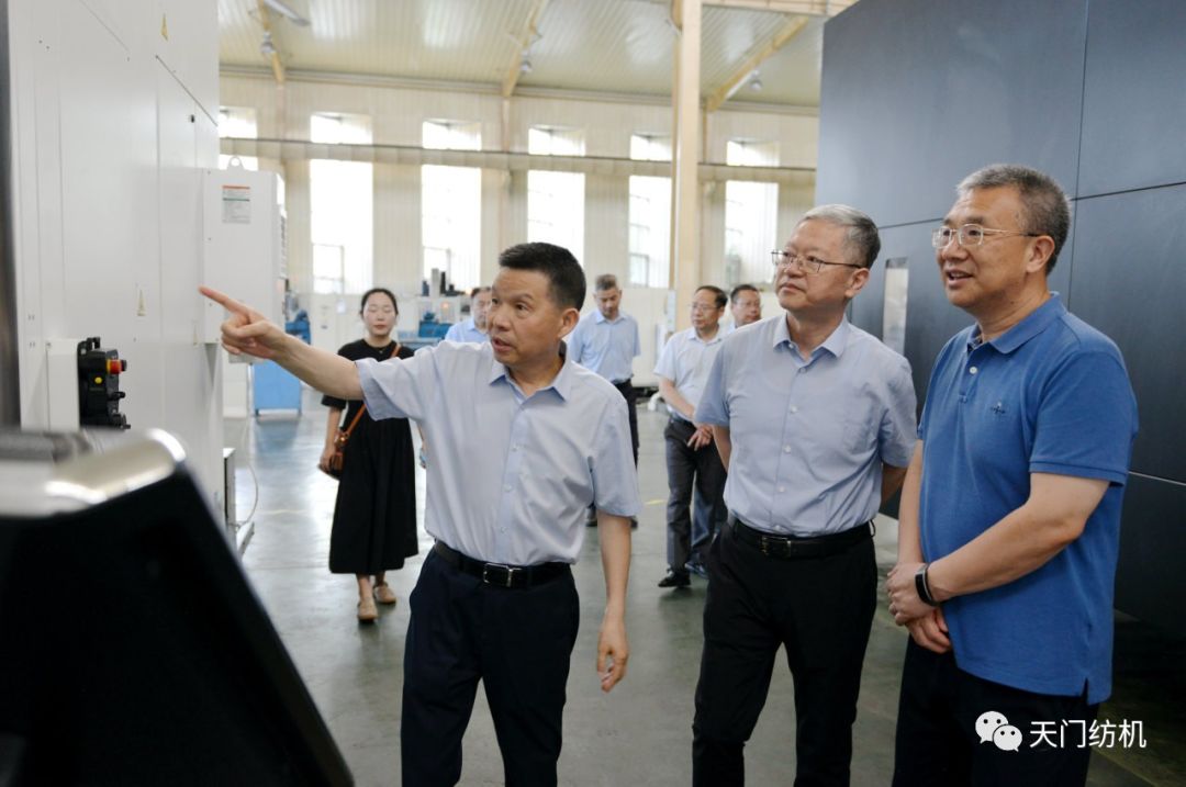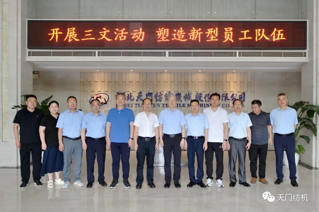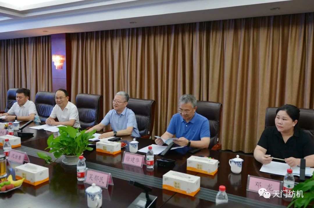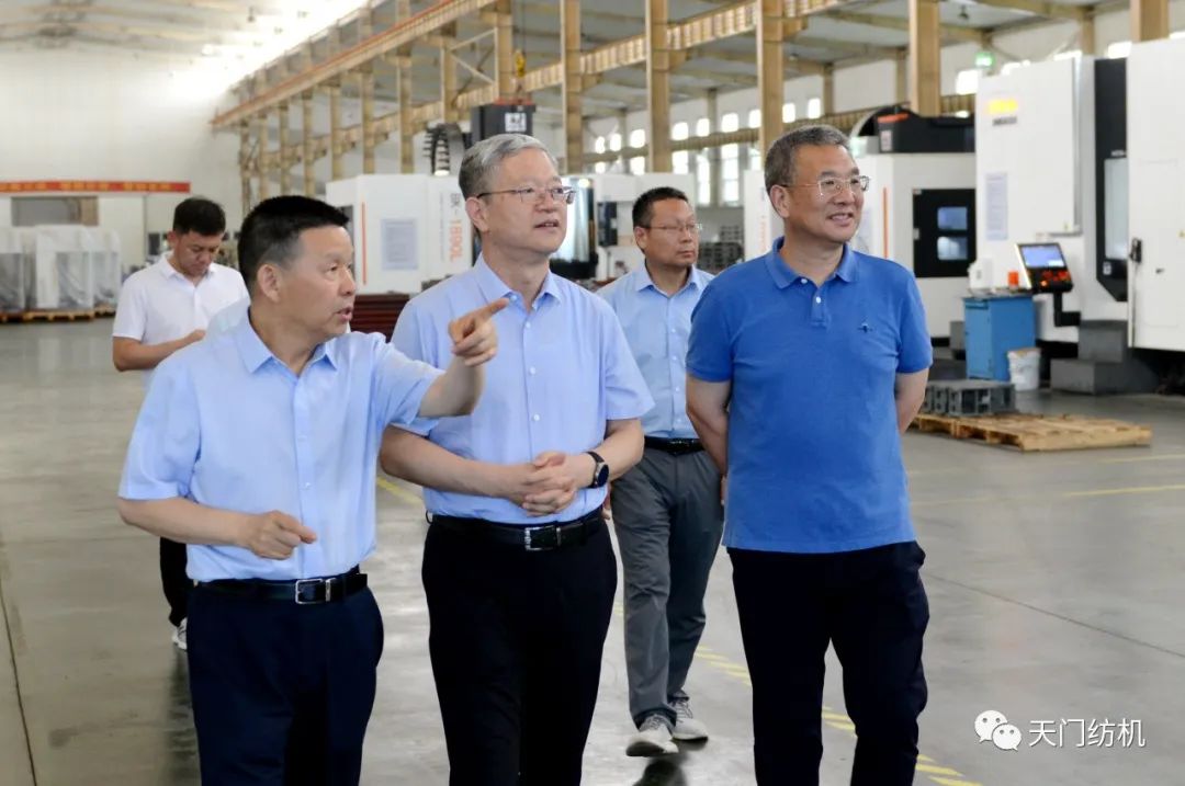 2023年6月27日下午,中國(guó)紡織工業(yè)聯(lián)合會(huì)秘書(shū)長(zhǎng)夏令敏,中國(guó)紡織工業(yè)聯(lián)合會(huì)流通分會(huì)副會(huì)長(zhǎng)徐建華、秘書(shū)長(zhǎng)王水元蒞臨天門(mén)紡機(jī)調(diào)研,湖北省經(jīng)信廳副廳長(zhǎng)周開(kāi)斌、消費(fèi)品工業(yè)處副處長(zhǎng)鄧龍陪同調(diào)研。