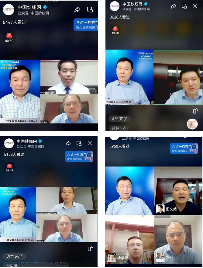 本次活動(dòng)進(jìn)行了6場(chǎng)直播。其間,天門(mén)紡機(jī)副總經(jīng)理?xiàng)钗姆寰图徔椦b備的發(fā)展趨勢(shì)作了深度剖析,分享了并條機(jī)牽伸形式、傳動(dòng)方式、換筒方式及自調(diào)勻整等方面的專(zhuān)業(yè)知識(shí);天門(mén)紡機(jī)品控總監(jiān)樊早斌、售后服務(wù)中心主任于少波分別就并條機(jī)操作、工藝要求、維護(hù)保養(yǎng)、常見(jiàn)問(wèn)題排查等方面的知識(shí)和經(jīng)驗(yàn)進(jìn)行了交流。線上學(xué)習(xí)氛圍濃厚,平均每場(chǎng)都有近6千人參加學(xué)習(xí),總計(jì)超3萬(wàn)余人。