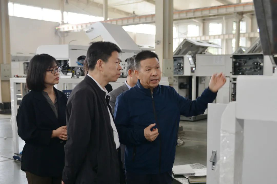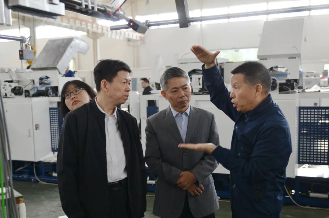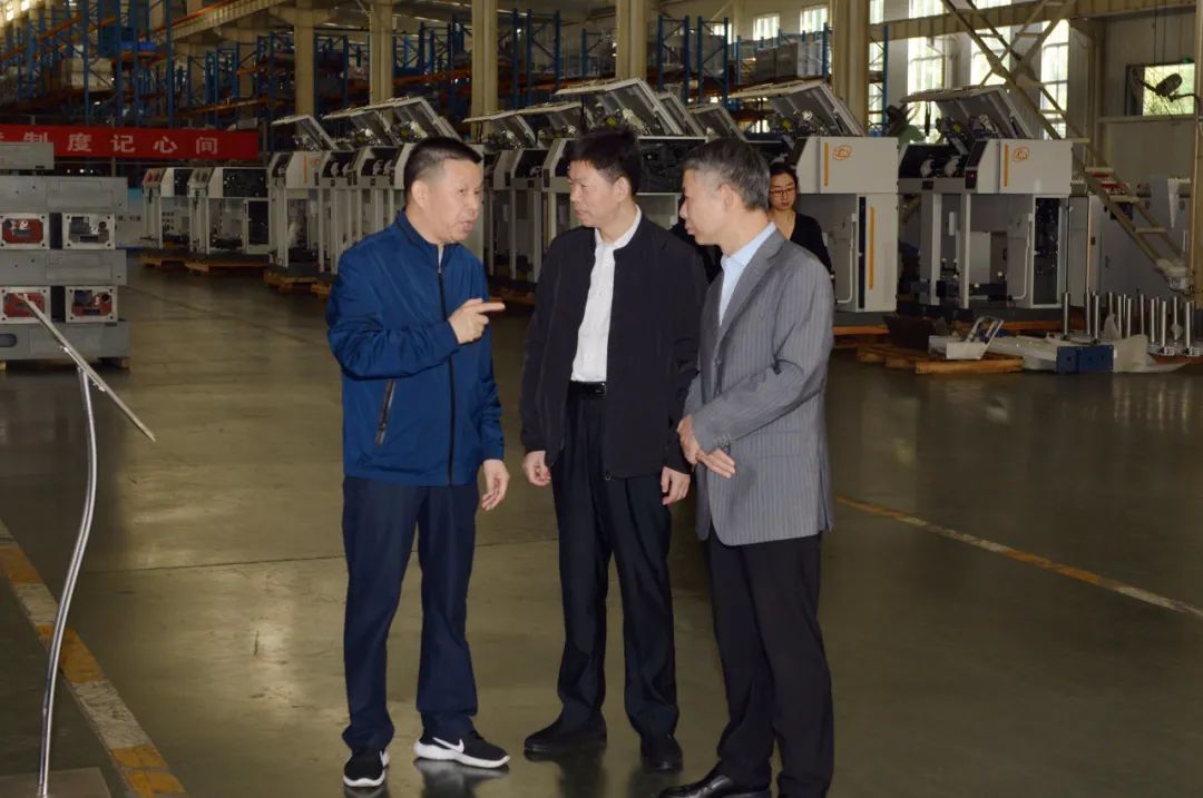 在車間現場,沈方勇董事長向單院長一行介紹了天門紡機目前的生產經營狀況、智慧工廠項目建設進展以及近年來科技開發(fā)取得的成績;詳細介紹了正在調試并即將赴上海參展的多臺全新樣機的情況。