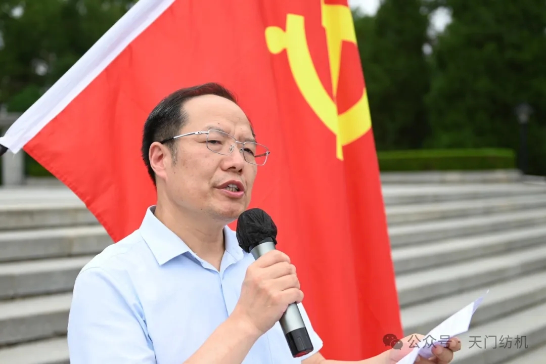 天門紡機黨委書記魯?shù)挛淖髁?ldquo;追尋紅色印記,踐行理想信念”的主旨報告。他回顧中國共產(chǎn)黨奮斗歷程時說:一百多年來,中國共產(chǎn)黨帶領(lǐng)中國人民浴血奮戰(zhàn)、篳路藍縷,從勝利走向勝利,完成了站起來到富起來再到強起來的偉大壯舉,實現(xiàn)了第一個百年計劃,第二個百年計劃也在如火如荼地進行之中,以習近平總書記為核心的黨中央帶領(lǐng)全國人民以中國式現(xiàn)代化全面推進中華民族的偉大復(fù)興。他強調(diào):無論歲月更迭、企業(yè)變遷,中國共產(chǎn)黨組織始終是天門紡機的政治引領(lǐng)、精神支柱、行動指南;無論是國有企業(yè)時還是民營企業(yè),黨員干部始終是戰(zhàn)斗堡壘、時代先鋒,在企業(yè)生產(chǎn)經(jīng)營活動中發(fā)揮著不可替代的作用。他希望全體黨員干部不忘初心,牢記使命,始終把企業(yè)放在心上,把工作重擔扛在肩上,為天門紡機高質(zhì)量發(fā)展貢獻應(yīng)有力量。