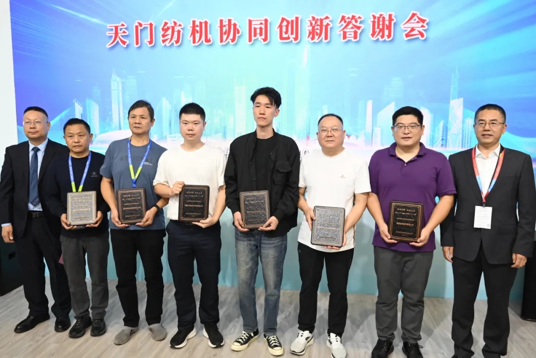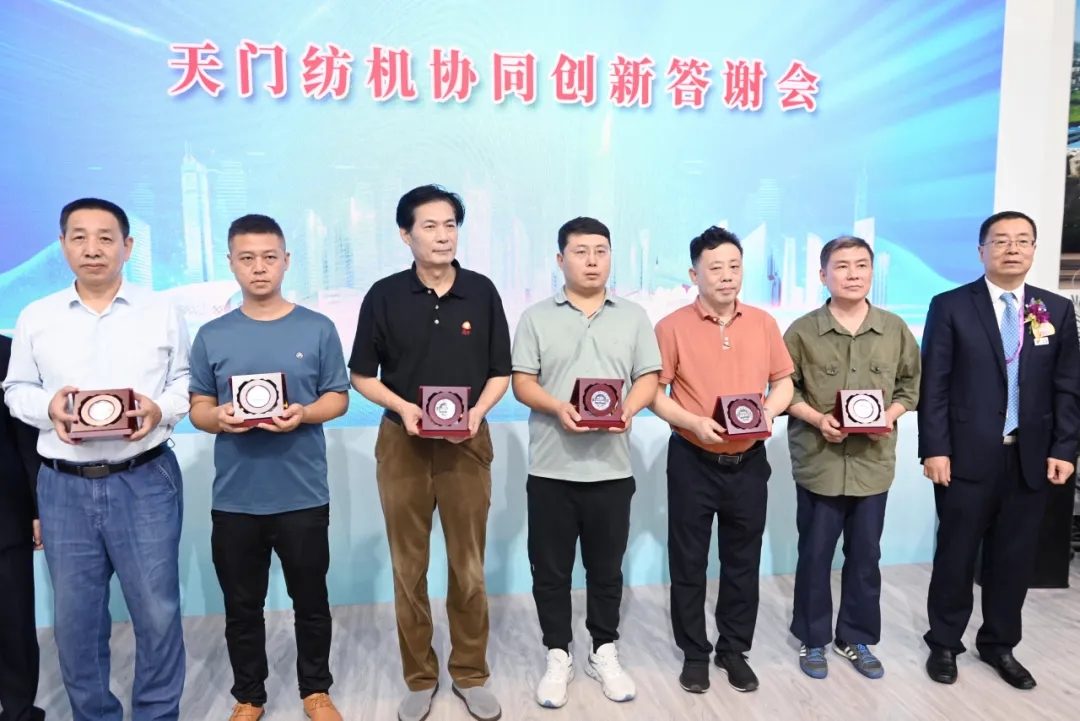 天門紡機(jī)總經(jīng)理焦倫進(jìn)宣布在協(xié)同創(chuàng)新中作出突出貢獻(xiàn)的單位和個(gè)人名單,中國(guó)紡織工業(yè)聯(lián)合會(huì)徐迎新副會(huì)長(zhǎng)為倪俊龍董事長(zhǎng)、陳冰教授、曹中華博士、陸惠文先生頒發(fā)紀(jì)念章,為臺(tái)達(dá)、匯川、南通五洲等3家企業(yè)代表頒發(fā)紀(jì)念牌。