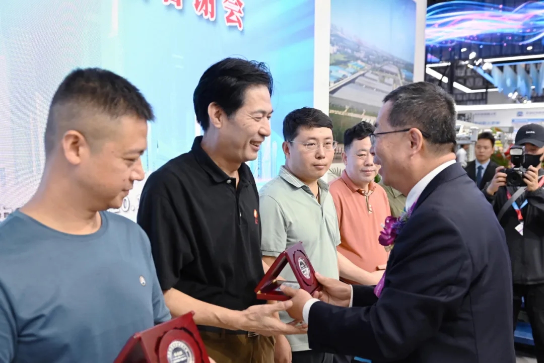 天門紡機(jī)副總經(jīng)理肖少華宣布為在并條新技術(shù)、新產(chǎn)品示范應(yīng)用上作出突出貢獻(xiàn)的華茂集團(tuán)、魏橋紡織、魯泰紡織等45家企業(yè)名單,中國(guó)棉紡織行業(yè)協(xié)會(huì)董奎勇會(huì)長(zhǎng)為這些企業(yè)代表頒發(fā)紀(jì)念牌。