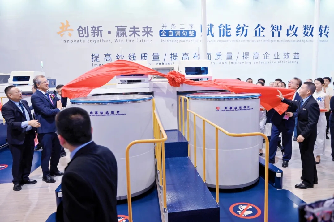答謝會(huì)結(jié)束后,隨即舉行了新產(chǎn)品揭幕、開機(jī)儀式。天門紡機(jī)今年展出了TM23、TM27H、TM29H、TM35等四款型號(hào)的并條機(jī)。中國(guó)紡織工業(yè)聯(lián)合會(huì)孫瑞哲會(huì)長(zhǎng)等行業(yè)領(lǐng)導(dǎo)、嘉賓一起為新產(chǎn)品揭幕,孫會(huì)長(zhǎng)為展機(jī)啟動(dòng)開機(jī)。